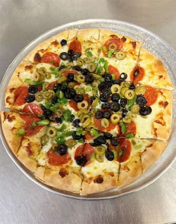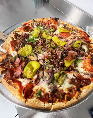 Artichoke hearts, bacon, banana peppers, black olives, green olives, green pepper, ham, mushroom, onion, pepperoni, pepperoncini, sausage, spinach, tomato.